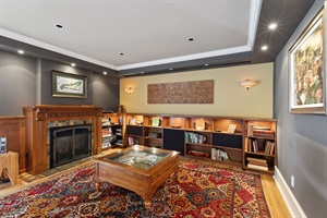 The elegant living and formal dining areas features a fireplace adorned with historic mantle, creating an ambiance of timeless warmth for intimate soirées. Entertain in grandeur within the bespoke chef’s kitchen, appointed with an expansive island, breakfast bar, and premium professional-grade appliances—perfect for crafting exquisite culinary experiences inspired by the ocean’s bounty.