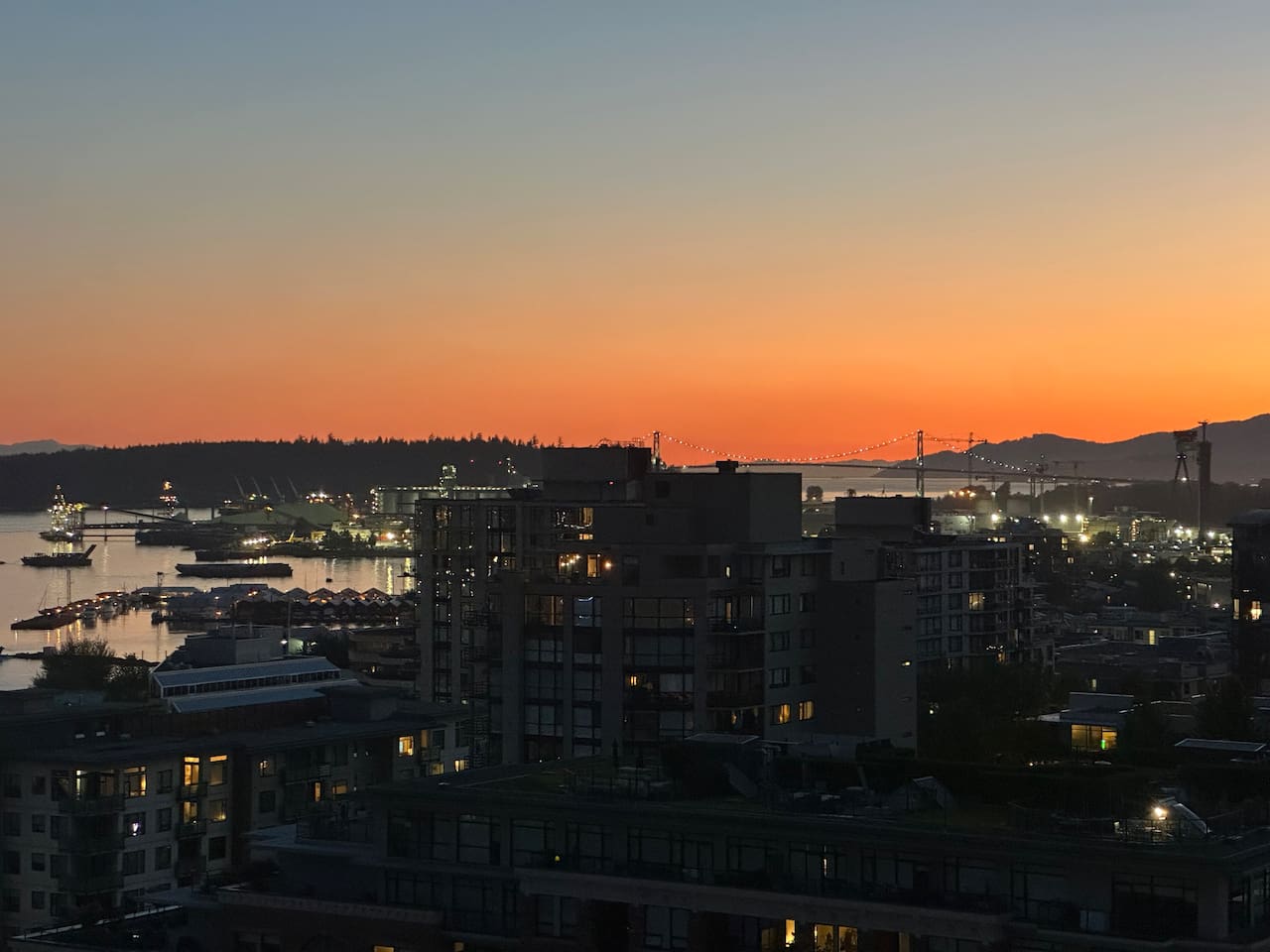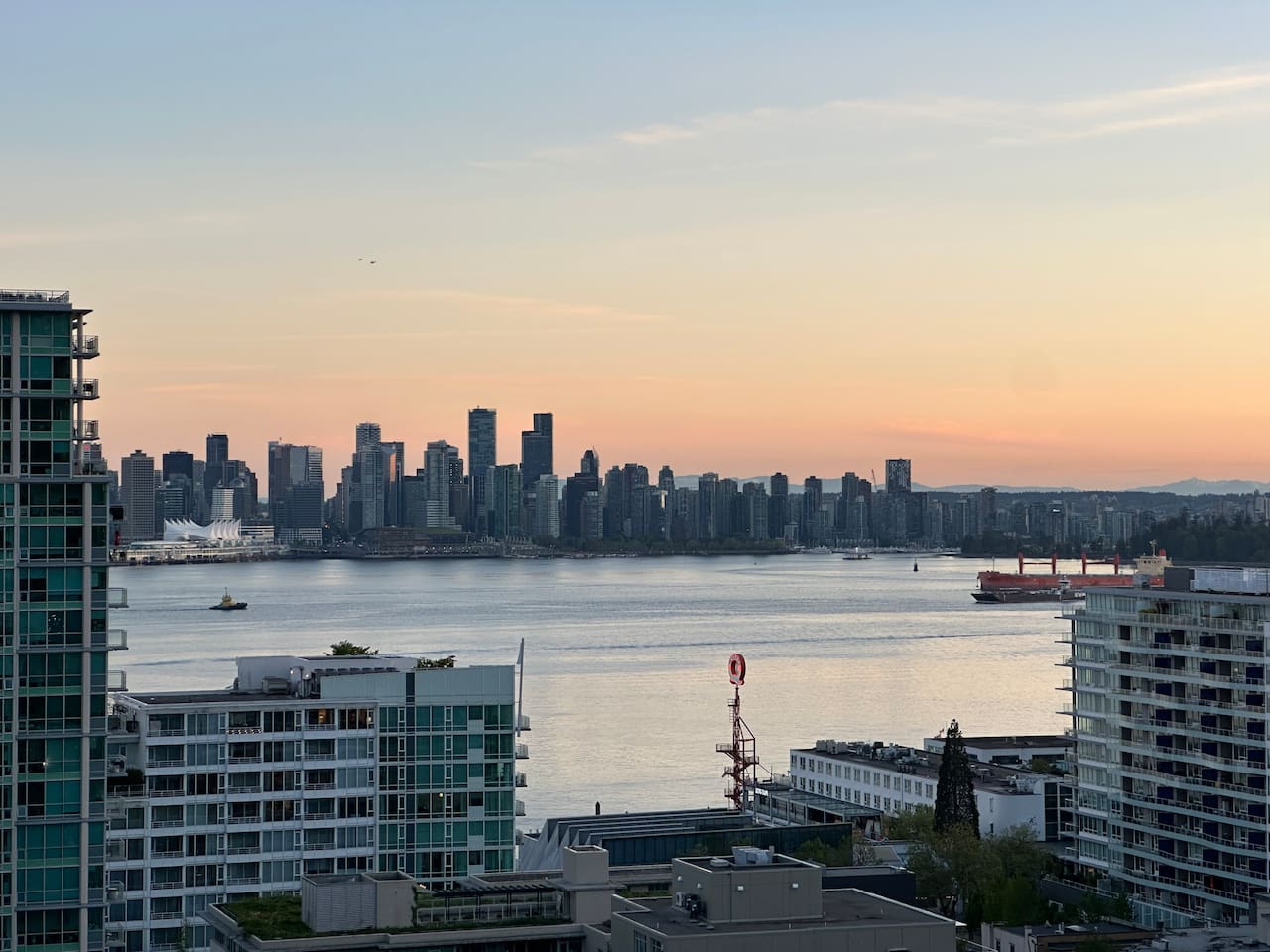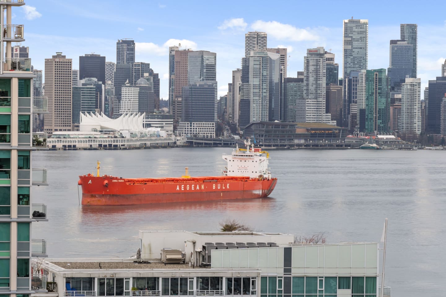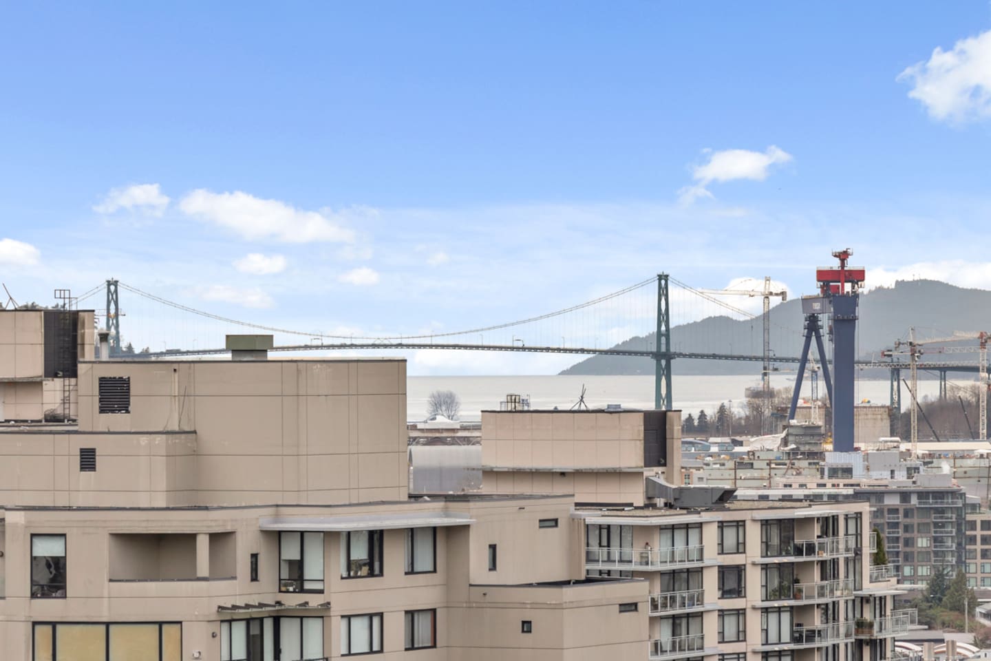 Enjoy panoramic views of downtown Vancouver, the Lions Gate Bridge, and Grouse Mountain, with floor-to-ceiling windows that fill the space with natural light.