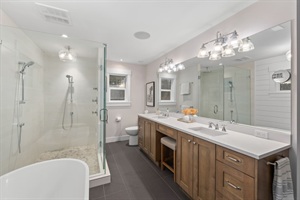 - Primary Bedroom: King bed, gas fireplace, full ensuite with soaker tub and stand-up shower